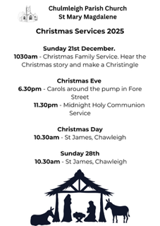 The church is used by the Academy for its Harvest and Christmas services and by the Town for its Old Fair service and British Legion Parade Service of Remembrance in November. The church is host to Chulmleigh Society concerts, including some by the Young Musicians Support, and drama, as well as the North Devon and Children's Hospice Christmas ‘Light up a Life’ service.